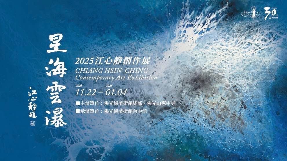 佛光緣美術館台中館,11月22日舉行「星海雲瀑-2025江心靜創作展」開幕儀式,佛光山中區總住持暨台中館館長覺居法師、主任知常法師,逢甲大學人文社會學院講座教授程代勒,台灣師範大學藝術學院院長莊連東及藝術愛好者近百人參與。