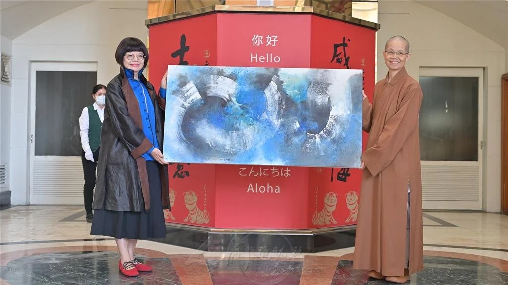 圖說:江心靜(左)致贈創作品(思網系列-天界之二〉予佛光緣美術館台中館典藏,由館長覺居法師(右)代